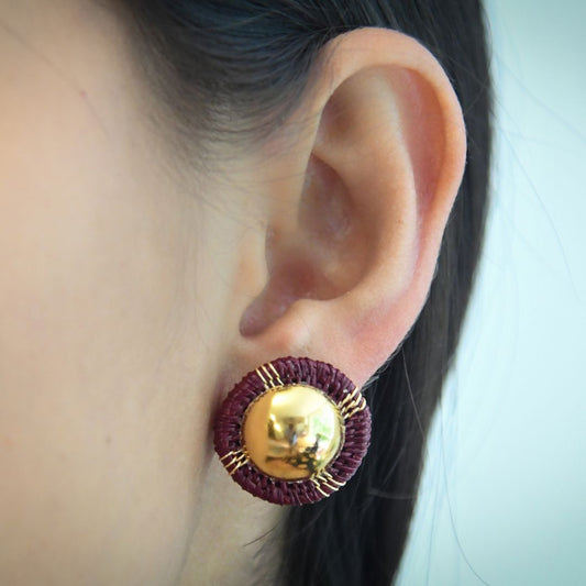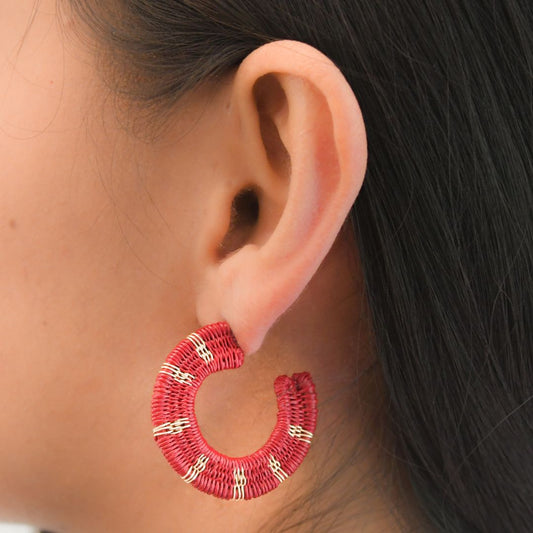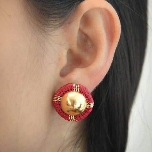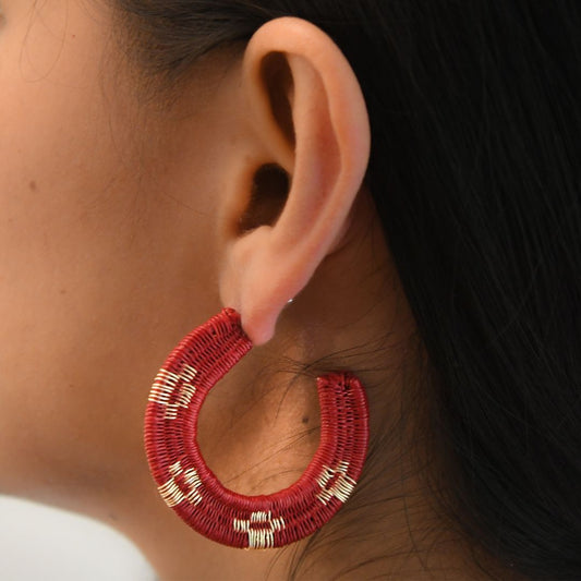 Créoles rouges tissées – fibres naturelles & fils dorés