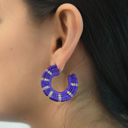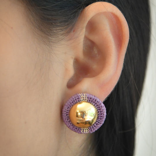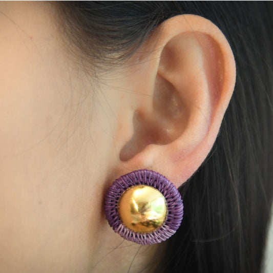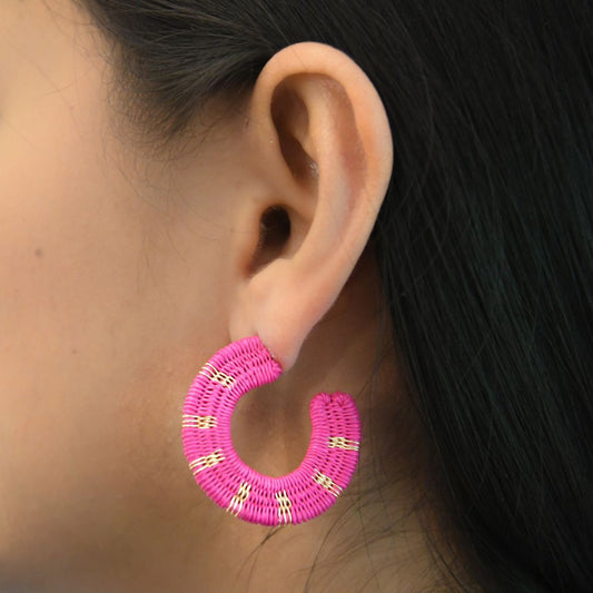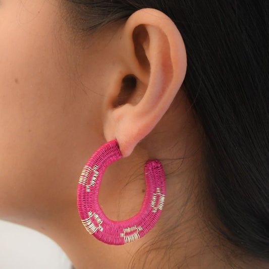 Créoles fuchsia tissées – fibres naturelles & fils dorés